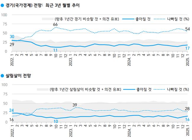 한국갤럽이 1월 14일부터 16일까지 실시한 조사에서 향후 1년간 우리나라 경제가 "나빠질 것"이라고 응답한 비율은 54%로 집계됐다. 이는 전월 대비 비관론이 감소한 수치로, "좋아질 것"이라는 응답은 17%, "비슷할 것"은 22%로 나타났다. 경기 비관론은 지난 2022년 10월 66%로 최고치를 기록한 이후 점차 완화되는 추세다.