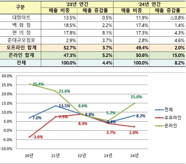 2024년 주요 유통업체 매출이 전년 대비 8.2% 증가하며 오프라인(2.0%)과 온라인(15.0%) 모두 성장세를 기록했다. 특히, 온라인 매출이 15% 증가하며 전반적인 성장을 주도했다.