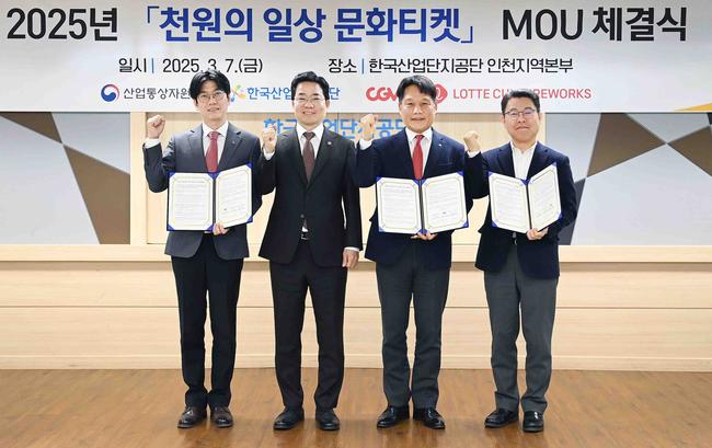 산업통상자원부는 3월 7일 인천남동산업단지에서 한국산업단지공단(CGV, 롯데컬처웍스)과 함께 ‘천원의 일상 문화티켓’ 협약식을 개최하고, 산업단지 근로자들의 문화·여가 생활 지원을 위한 협력 방안을 논의했다.