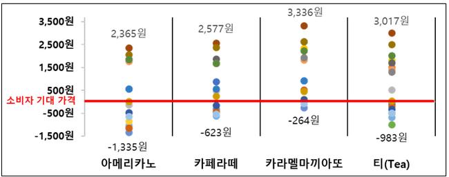 이번 조사에 따르면 아메리카노의 평균 판매가격은 3,001원으로 소비자 기대 가격(2,635원)보다 13.9% 비쌌으며, 카라멜마끼아또는 4,717원으로 기대 가격(3,564원)을 32.4% 상회했다.