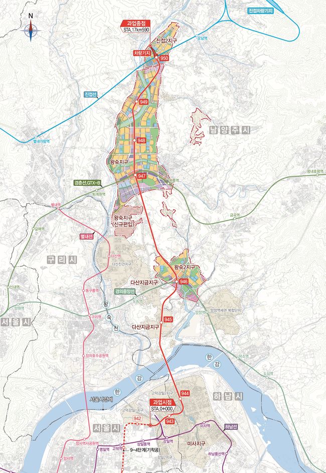 `강동하남남양주선 광역철도`는 3기 신도시 남양주 왕숙·왕숙2지구의 교통개선을 위한 사업이다. 서울도시철도 9호선 연장으로 서울 강동구에서 경기 하남시를 거쳐 남양주시 진접2지구까지 연장 17.59km, 정거장 8개소, 차량기지 1개소를 신설할 예정이다. 총사업비 2조 8,240억 규모의 철도 노선으로 2031년 개통을 목표로 추진 중이다.