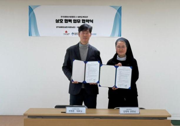 지난 5일 석영준 한국캠핑산업협회 사무총장(왼쪽)과 김명옥 성분도복지관 관장이 상호 협력에 관한 업무협약(MOU)를 체결하고 기념촬영을 하고 있다