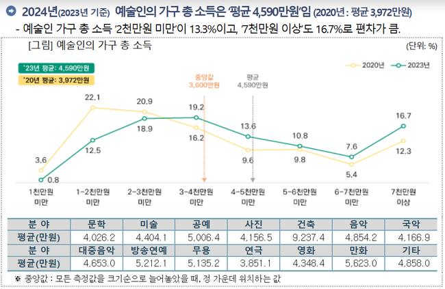 문화체육관광부(장관 유인촌, 이하 문체부)는 한국문화관광연구원(원장 김세원)과 함께 `2024 예술인 실태조사` 결과를 발표했다.