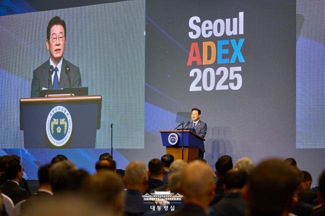 이재명 대통령이 20일 경기 고양시 일산서구 킨텍스에서 열린 서울 ADEX 2025(서울 국제 항공우주 및 방위산업 전시회 2025) 개막식에서 축사를 하고 있다.