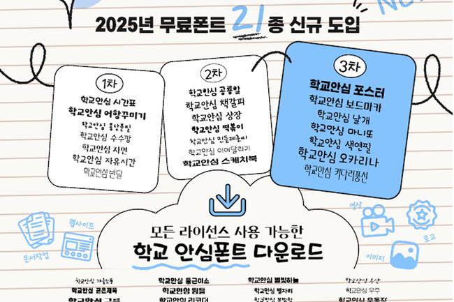 교육부, ‘학교 안심폰트’ 21종 신규 보급…저작권 걱정 없는 교육자료 제작 지원 - 총 65서체 88종 무료 제공…누구나 자유롭게 다운로드 가능 - 수업자료·가정통신문·행사 안내문 등 학교 현장 활용도 높아 - 교육부 “저작권 부담 없는 창의적 교육환경 지속 지원할 것”