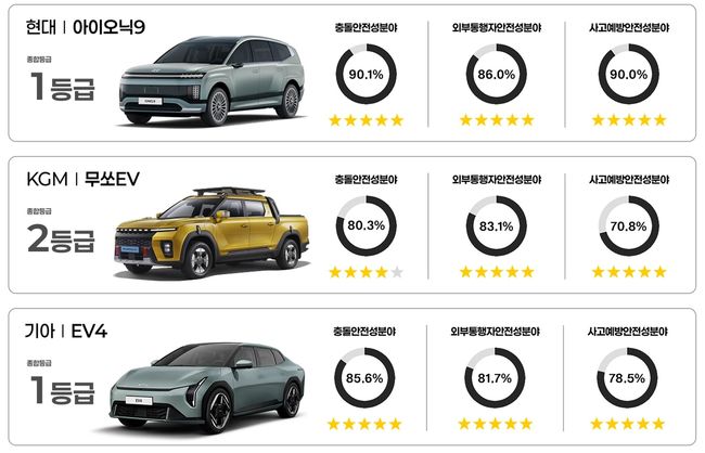 종합평가에서 현대 아이오닉9, 현대 팰리세이드, 현대 넥쏘, 기아 EV4는 3개 분야에서 모두 우수한 성적을 받아 1등급을 획득했다. BMW iX2, KGM 무쏘EV, 기아 타스만은 2등급, 혼다 CR-V는 3등급, BYD 아토3와 테슬라 모델3는 4등급, 포드 익스플로러는 5등급으로 평가됐다.