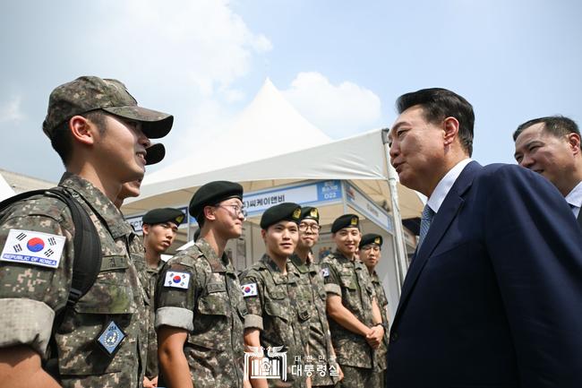 윤 대통령이 박람회장 부스를 이동할 때마다 군복을 입은 장병들은 대통령 주변으로 몰려와 “충성”하며 거수경례했다. 윤 대통령은 장병들에게 소속은 어디인지 물으며 한명 한명과 악수를 하면서 국가 안보를 위해 고생하는 장병들을 격려했다. 윤 대통령은 또한 장병들의 사진 촬영 요청에 흔쾌히 응하며 즉석에서 기념 촬영을 했다.