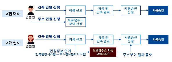 기존에는 건축주가 착공 신고와 별도로 도로명주소 부여를 신청해야 했으나, 이번 개선으로 착공 신고와 동시에 도로명주소가 자동 부여된다. 지자체는 건축행정시스템 ‘세움터’와 주소정보관리시스템(KAIS)을 연계해 이를 처리한다.